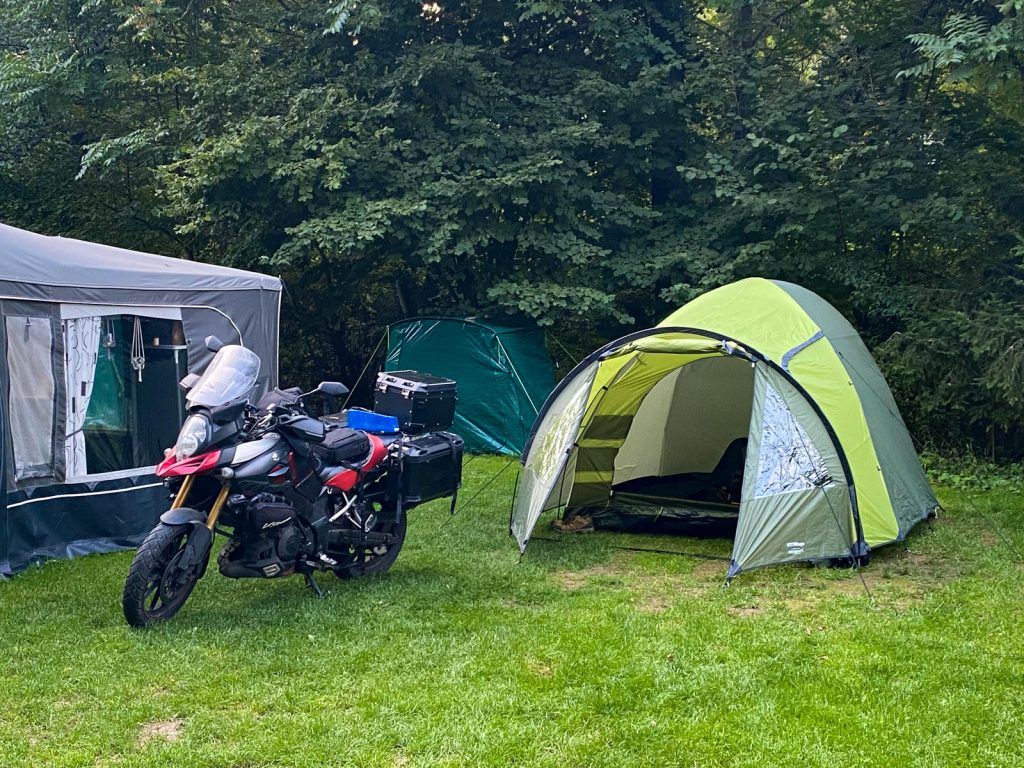 I went back to the bike, took the cairns 3 off the bike, strapped on the new tent onto the bike and then dumped the cairns in the nearest wheely bin. The new tent is great. About 1 kilo heavier and the same pack-size but loads more space. More importantly, I can stand up straight and it’s nice and bright inside. I feel like a human being again. It’s a German made tent made by a company called Berger, and it’s a four-man, with more than enough space for me, my bed and all my kit, and also enough space in the vestibule to sit and cook or store my gear.