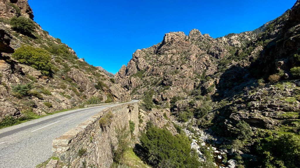 Further along I stopped at the lake at Calacuccia, and while sitting on a wall and admiring the view of the lake and the surrounding mountains I had a drink and munched through a bag of nuts – like a chimp on a picnic… Coming down from Calacuccia was brilliant, the route was mostly downhill but the road followed canyons for at least 10km, with a narrow and very twisty road plus a very steep drop to the right of me – and without a barrier for much of the time. Oo, er, missus…