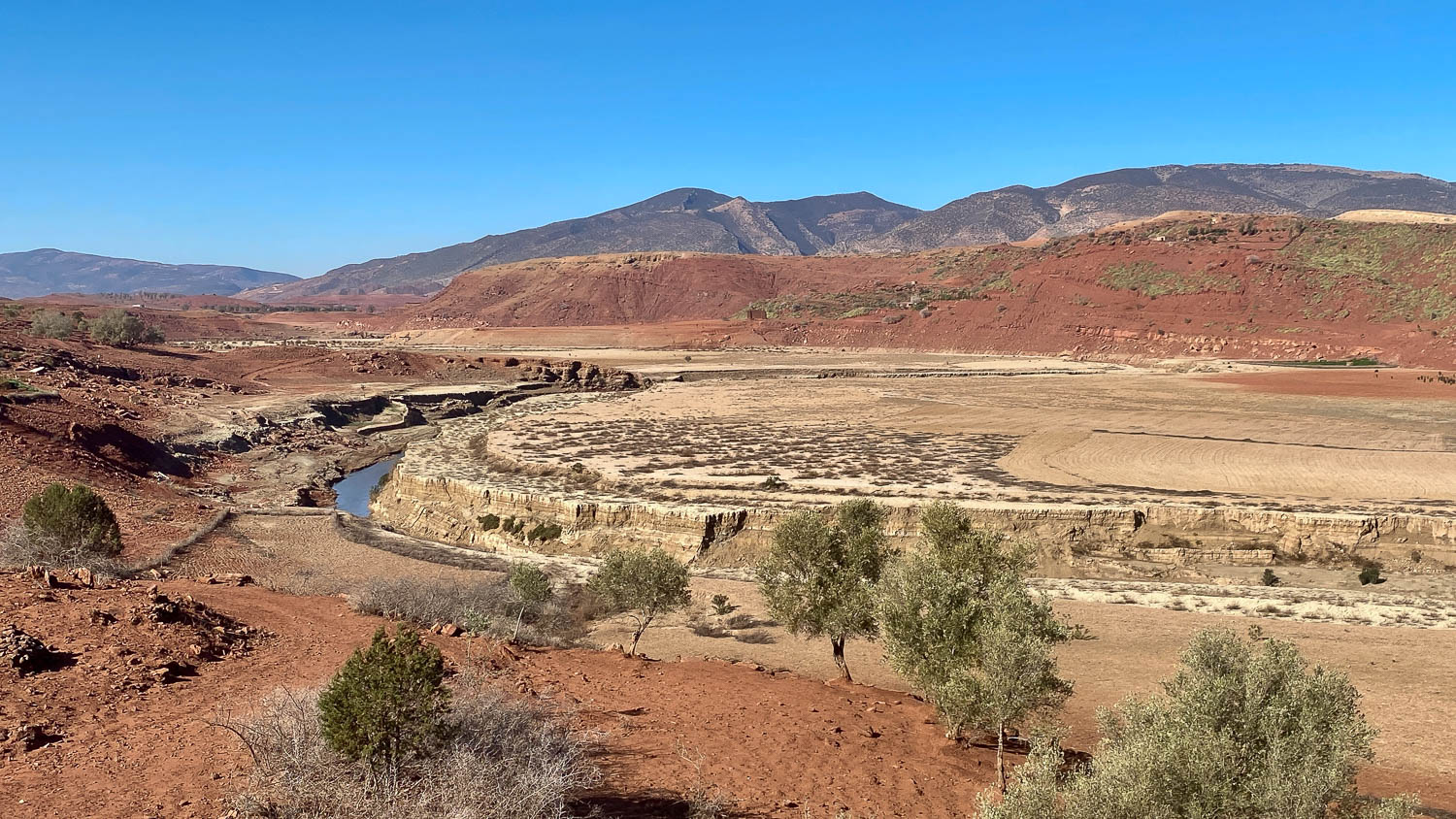 Leaving the olive grove this morning I missed yesterday’s tyre tracks and ended up in some soft sand. I couldn’t go backwards and ahead of me was a lot of large stones so I gingerly got the bike over them and onto the road. Phew…! If you get off the road, always try to re-trace your tracks when going back…! Heading back towards Bin El-Ouidane and the lake I visited yesterday, I went around it and headed east into the mountains.