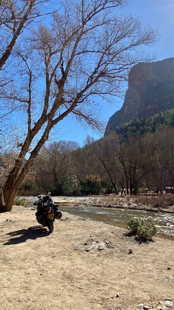 A few miles before La Cathedrale as you crest a hill you get your first glimpse of the mountain – and its an incredible sight. As you get closer, and with every hill you crest you get more sightings and the mountain just gets bigger and bigger. According to my map there is an official campsite nearby but about 3km before I saw a lovely area next to the river that would make a great campsite. The intention today was to come here then backtrack and go to another campsite near Beni-Mellal, but as soon as I saw this flat area next to the river I decided to call it a day and camp for the night.