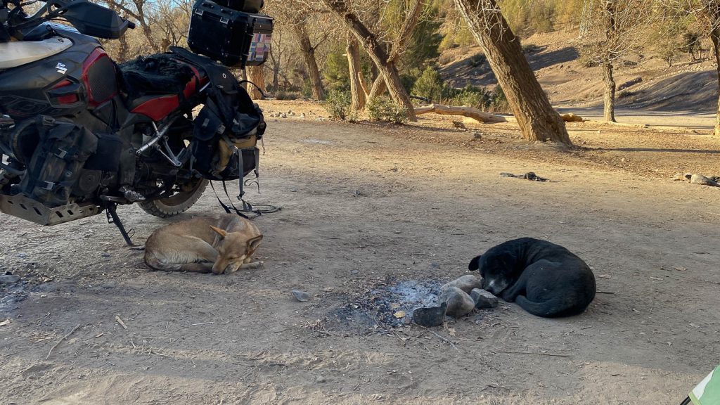 There is the occasional passing car, donkey, chicken or person going to the nearby village. Two dogs seem to have adopted me as well. When I arrived and got the tent up they were hanging around so I gave them some spare food and now they have taken up residence and adopted me. Other than that, it’s a great place to camp, especially as you can hear the lovely sound of the water running over the rocks in the river. I may stay for the night or I may stay for two days here, I really don’t know. I’ll see how cold it is overnight before I make a decision…!