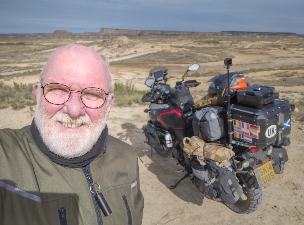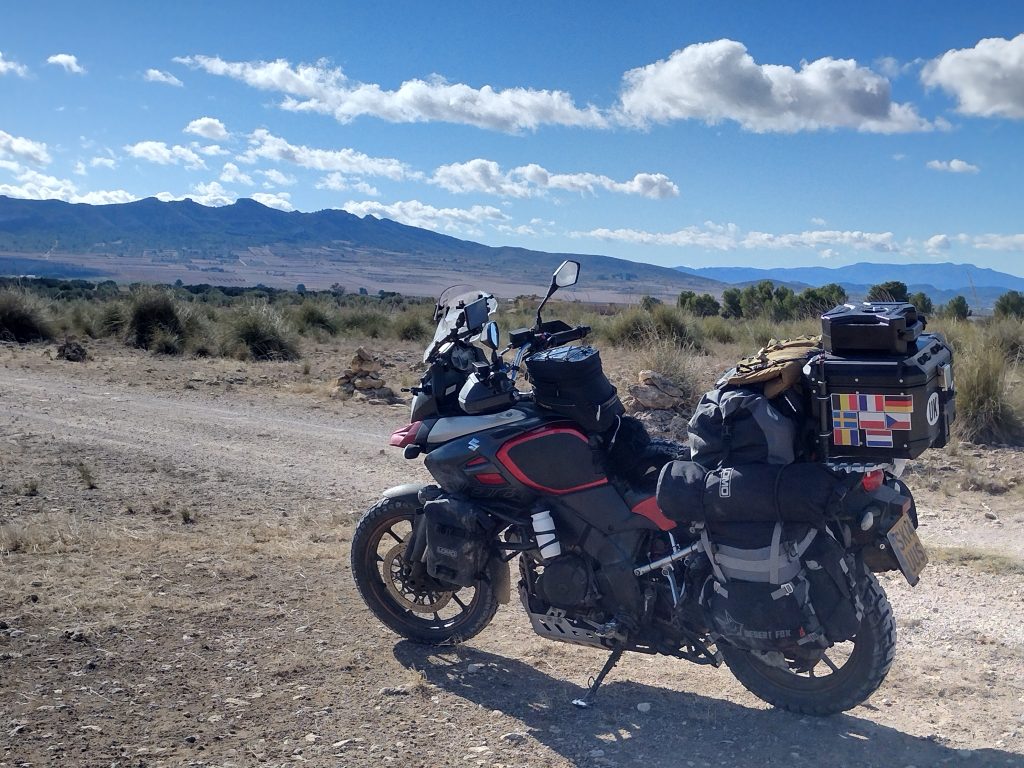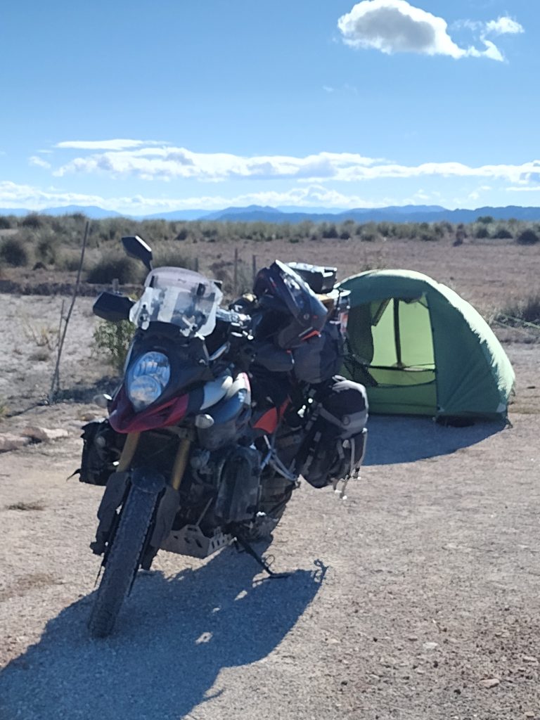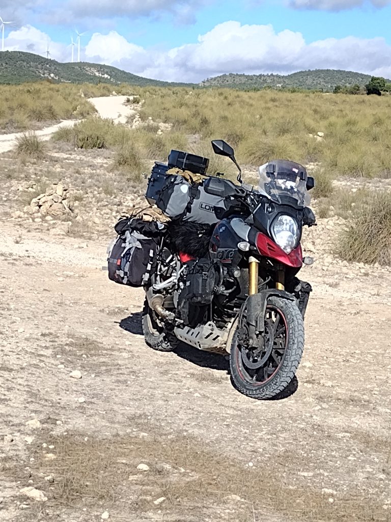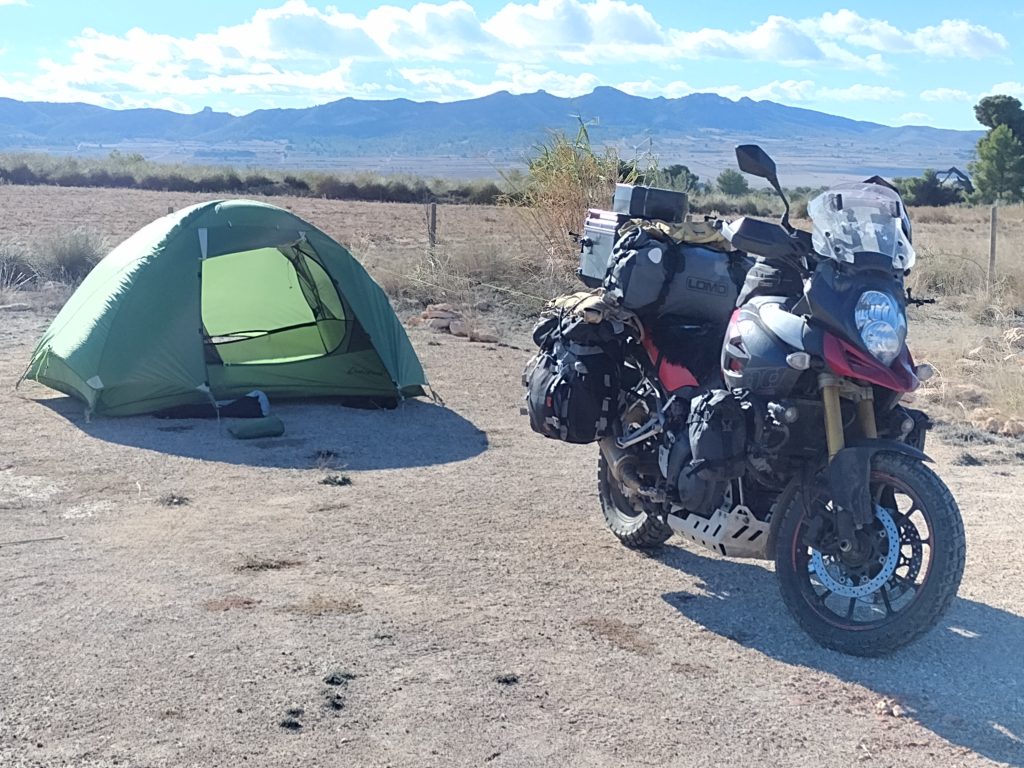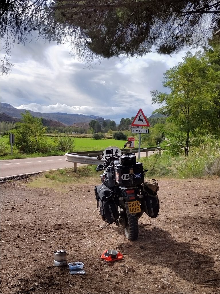 Well, what a good day. I rode around 275 miles today, heading inland using A and B roads instead of motorways. And it was great, because you get to see all the countryside instead of four lanes of tarmac. And there was some terrific twisty bits. The day started at 16 degrees and by the time I got to my camp, it was 23 degrees. Looooovely… This evening there’s a storm brewing to the north, but I think it will miss us. The thunder and lightening was very impressive, with proper thunderbolts, which I’ve not seen for quite a few years. At the moment I’m about 50 miles inland from Alicante on a very barren plateau. I had to use a rock to hammer my tent pegs home as there’s not much here but scrub and rock. Tomorrow I’m heading for Murcia and then Granada. I may even pay for a camp site, as I think I need a shower…