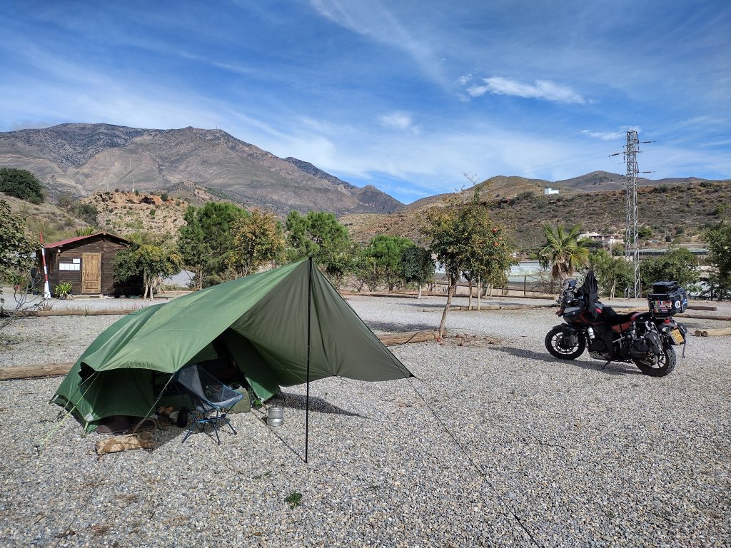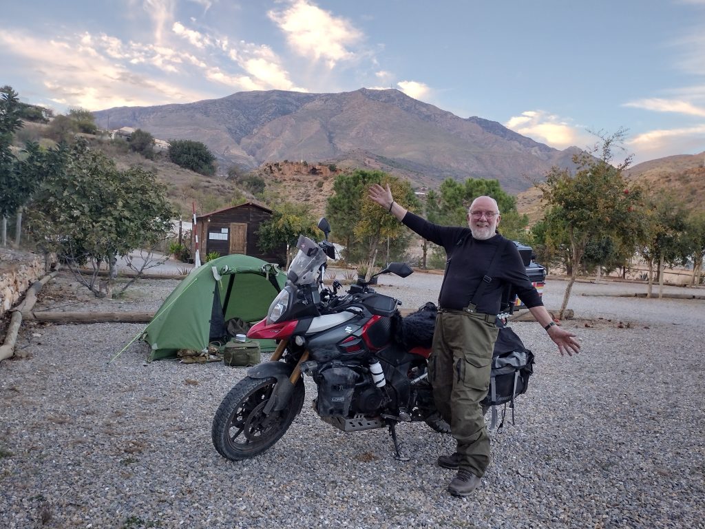 Well, today was around 300 miles. I was going to take the country roads but I opted to take the stradas to make up some miles, heading down to Murcia and then taking the Mediterranean highway. The weather was blue skies all the way and this afternoon it was 26 degrees – and I finally got to open the vents on my riding clothes. I’m now on an official site at Motril, which is about 40 miles east of Malaga. I’m the only person on the site, which means I have the ablutions all to myself…! It’s 10eu a night, with electricity, shower and toilet, and there’s orange and pomegranate trees around the site. You can help yourself, which I intend to do. I’m spending two nights here to sort myself out and have a bit of a rest then I’m catching the ferry to Al Hoceima in Morocco on Thursday – all being good.
