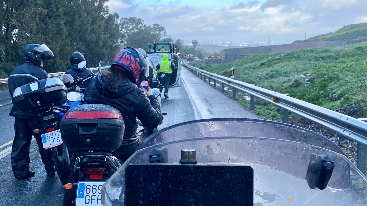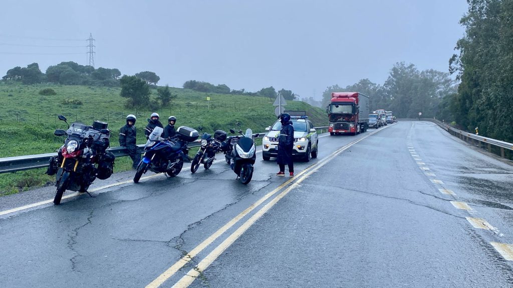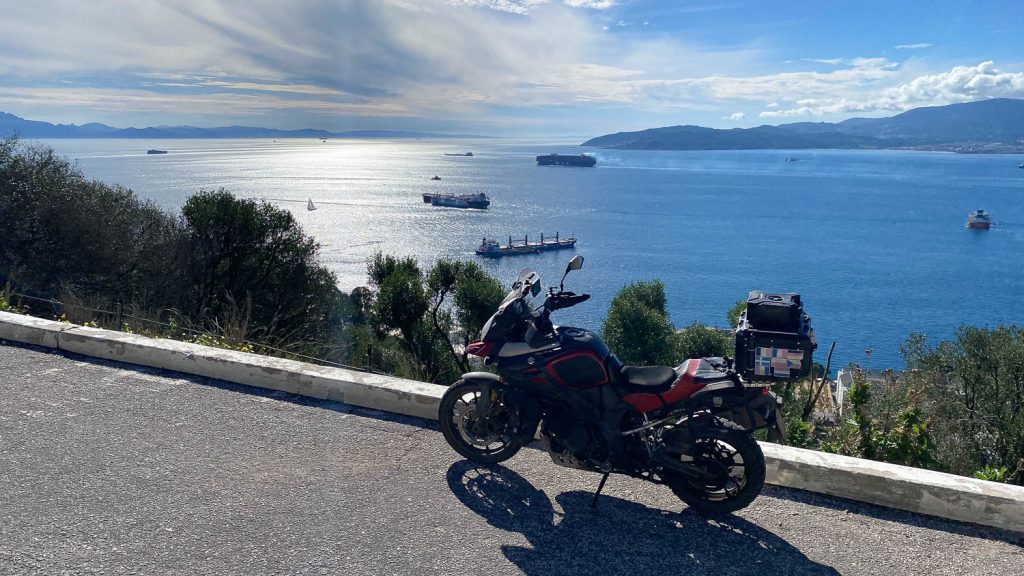 Arriving at Tarifa, the disembarkation, passport control and customs was super quick and by 4.30 I was on the road heading to Algeciras and Gibraltar. Not long after Terifa, as you start coming down from the hills towards Algeciras, there was a traffic jam. It also started raining. Deep joy…! The jam was for about 5km so I just went on the outside or inside of the traffic to the front of the queue – and it was the farmers blocking the road with tractors as far as the eye could see. Protests..! I had read about all the farmer’s protests in Europe and had completely forgot about them. So, with about 6 other bikes at the front of the queue I left the bike and found a place under a tree for shelter and started to wait. I feel quite sorry for the farmers, so I was quite happy to wait.