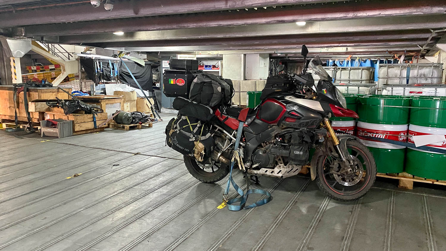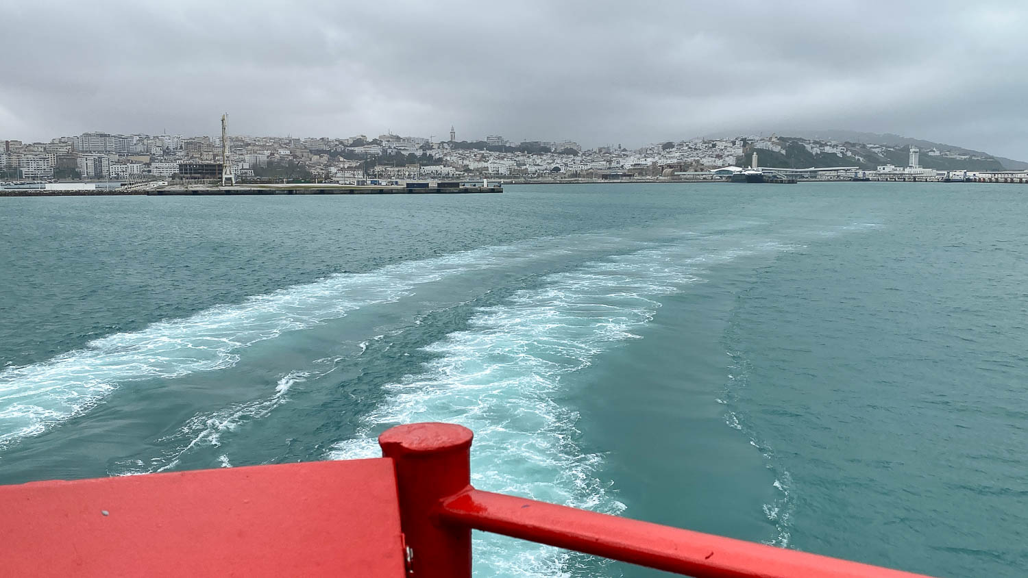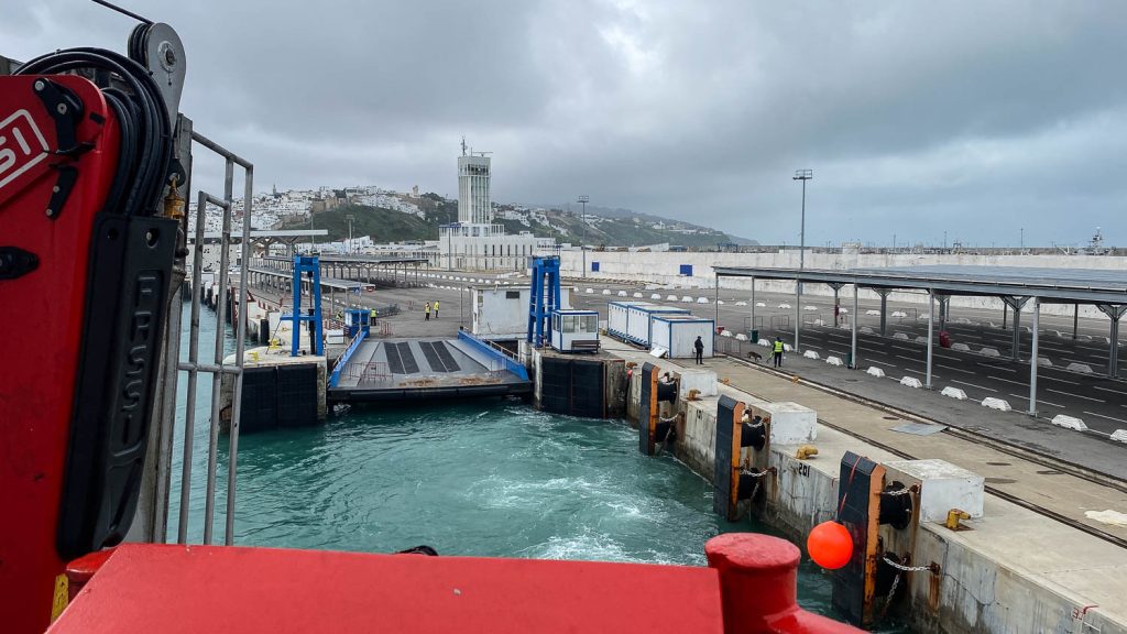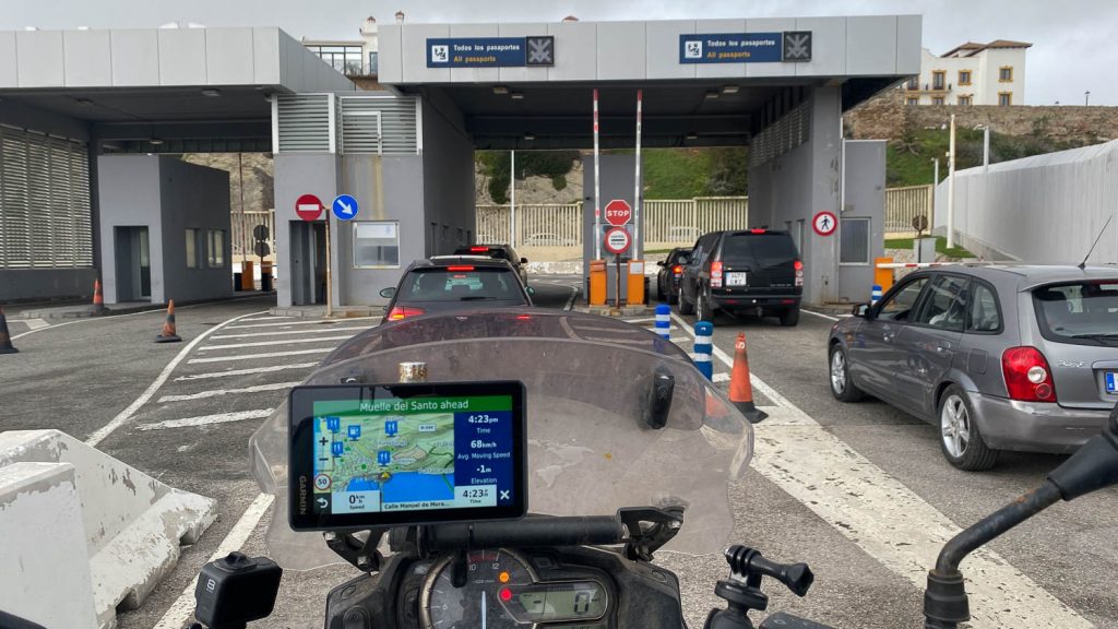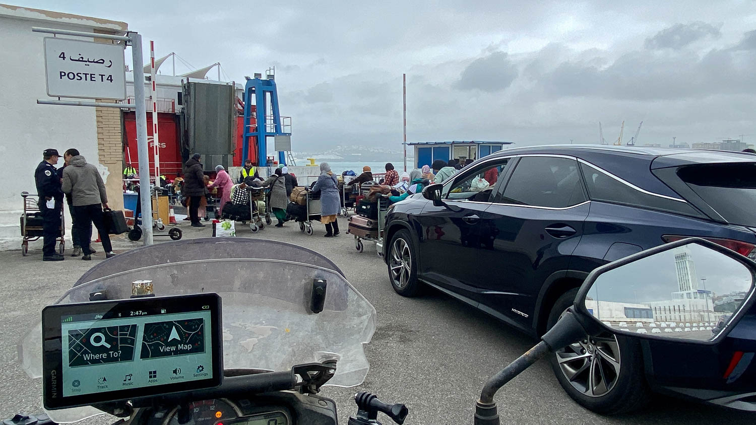It was just before 2 and having a quick search online I saw there was a ferry from Tangier City to Tarifa in Spain at 3pm – so I bought an online ticket and got to the port just after 2. I had to ‘check-in’ to get my paper tickets and then I was directed to the Douane to get my vehicle logged out of Morocco, and then to Passport control to get stamped out of Morocco, and then to the giant X-Ray machine which x-rays 6 cars (and a bike) at a time. Then it was a quick stop so the drugs dog can check my bike – always a tense moment, and thankfully I had no sausages – and then it was a quick ride over to the ramp to wait for boarding.